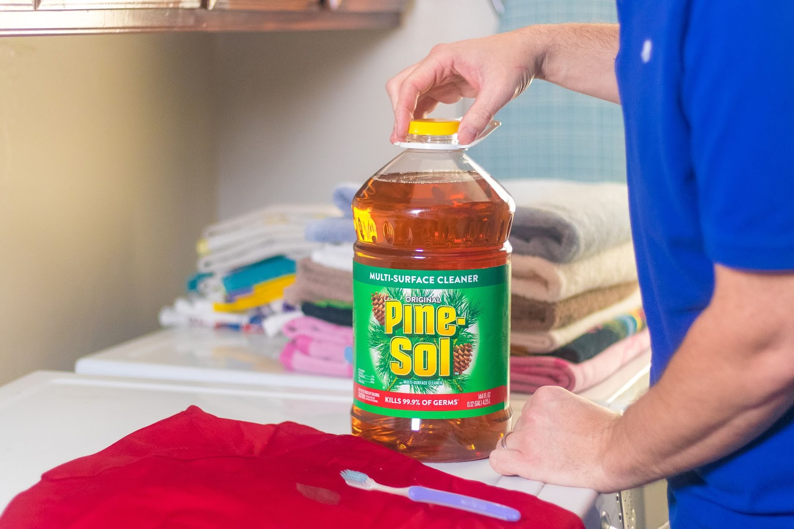 Pine-Sol désinfecte et tue 99,9% des germes. En plus des vêtements, vous pouvez utiliser le nettoyant multi-surfaces Pine-Sol sur les surfaces dures et non poreuses, y compris les planchers (tels que le bois dur fini et les tapis), les éviers, les comptoirs (tels que le granit), les baignoires, les cabines de douche, les carreaux et plus encore. Nous aimons utiliser Pine-Sol car il désodorise et a un parfum propre et frais!