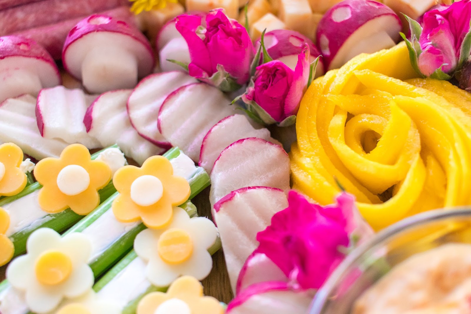 J’ai eu l’idée d’une planche à fleurs de printemps parce que je pensais que ce serait amusant de mélanger votre nourriture de planche de charcuterie normale avec des fleurs d’art alimentaire avec de vraies fleurs comestibles! J’ai commencé avec Radis Dandy car ils sont beaux, savoureux et sont disponibles dans les variétés Ready Radish, Radish Coins et Radish Ministicks. Ces radis sont frais et prêts à sortir dès la sortie de l’emballage.