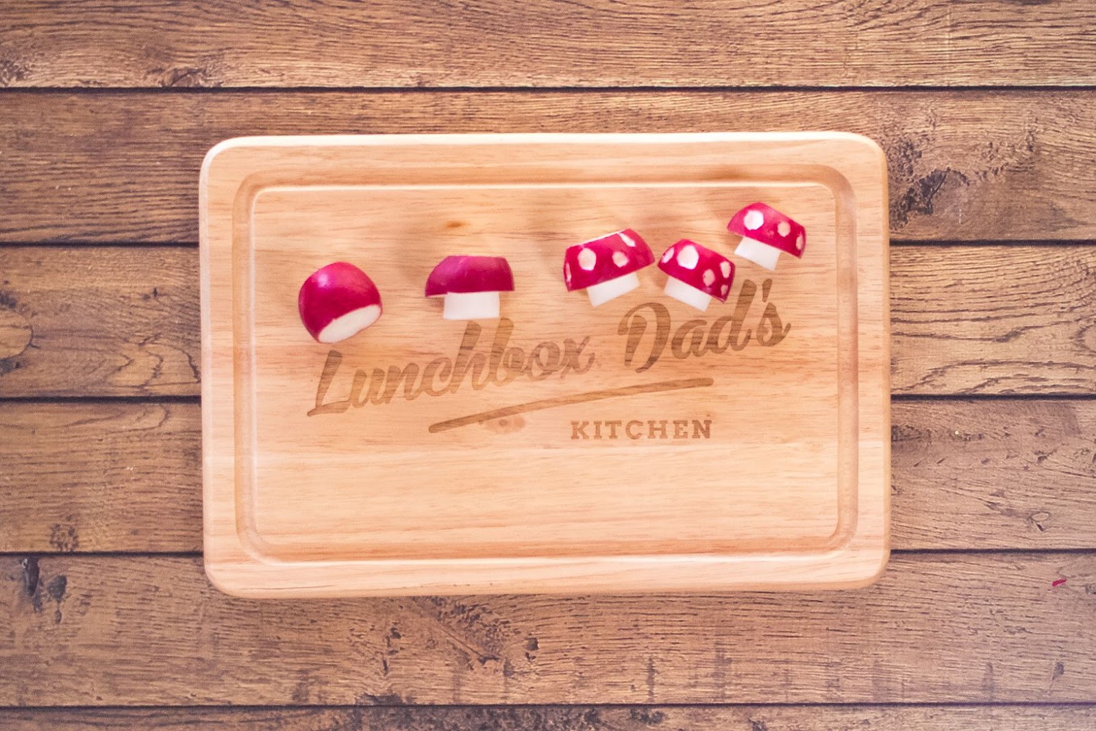 J’ai commencé par couper les radis Dandy Ready en champignons pour en faire la pièce maîtresse de cette planche. Pour les faire, prenez simplement un radis prêt, faites une coupe peu profonde autour de la circonférence du fond. Coupez ensuite les morceaux pour faire la tige. Terminez en découpant de petits cercles pour les taches.
