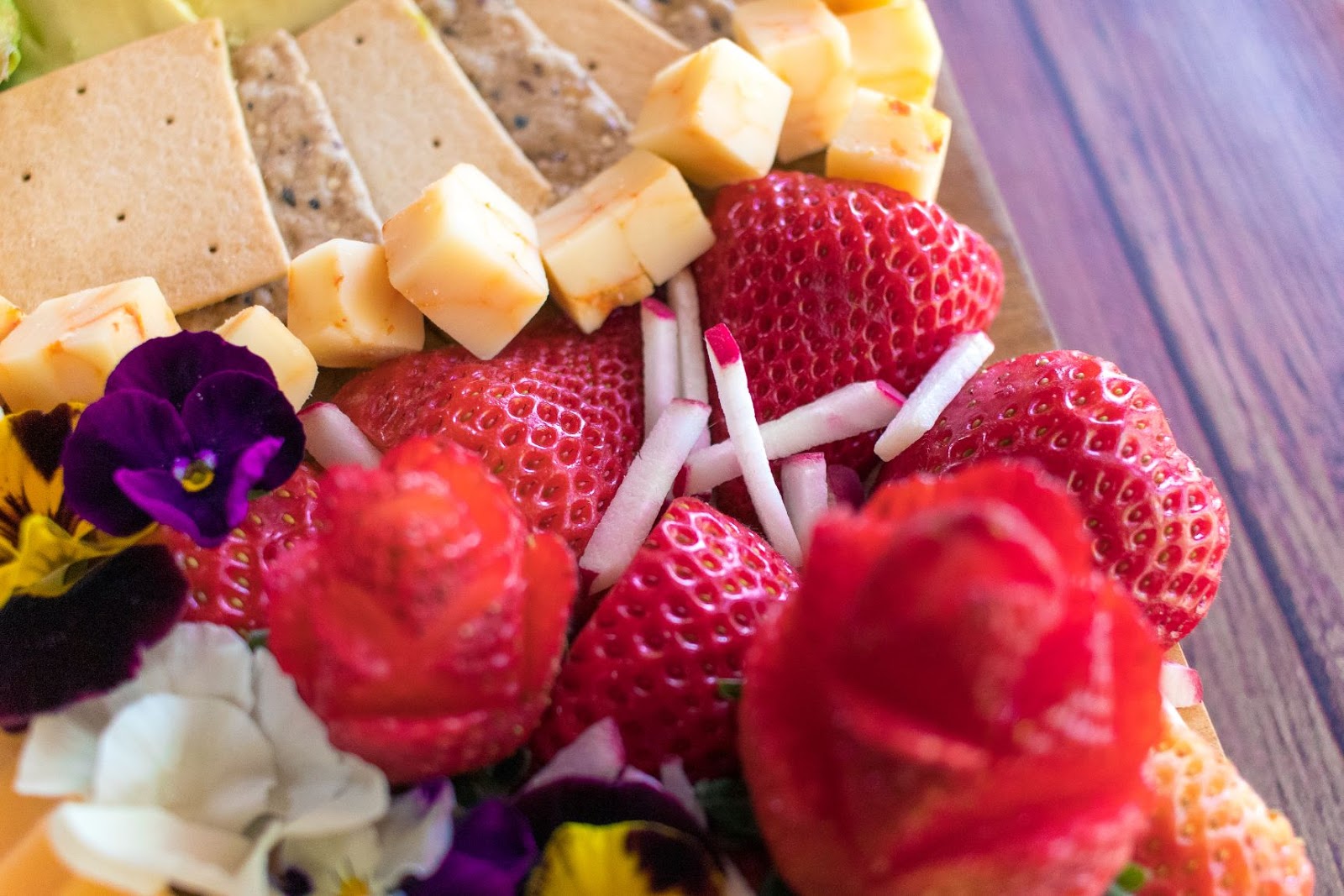 Les touches finales sont des fleurs comestibles. Beaucoup de vos fleurs communes que vous pouvez trouver dans votre magasin ou pépinière locale sont parfaites pour cela. Les fleurs comme les roses, les pensées, les chrysanthèmes, les roses trémières, les soucis, etc., peuvent être consommées en partie ou en totalité. Assurez-vous de vérifier que la variété que vous souhaitez utiliser est sûre et également propre de tout produit chimique. Pour cette planche alimentaire, ce sont principalement pour la décoration ou la décoration, mais il est amusant de les manger aussi!