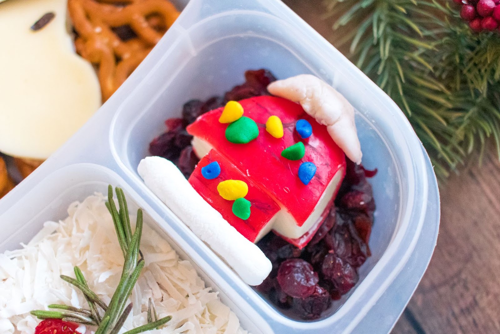 4. Pour la niche de Snoopy, coupez le toit et la partie principale du fromage Babybel, en laissant la cire rouge allumée. Tracez les lignes noires avec un marqueur de sécurité alimentaire, puis faites les lumières de Noël et la neige avec du fondant. Utilisez des canneberges séchées ou un autre fruit frit comme arrière-plan et placez-les dans le compartiment latéral.