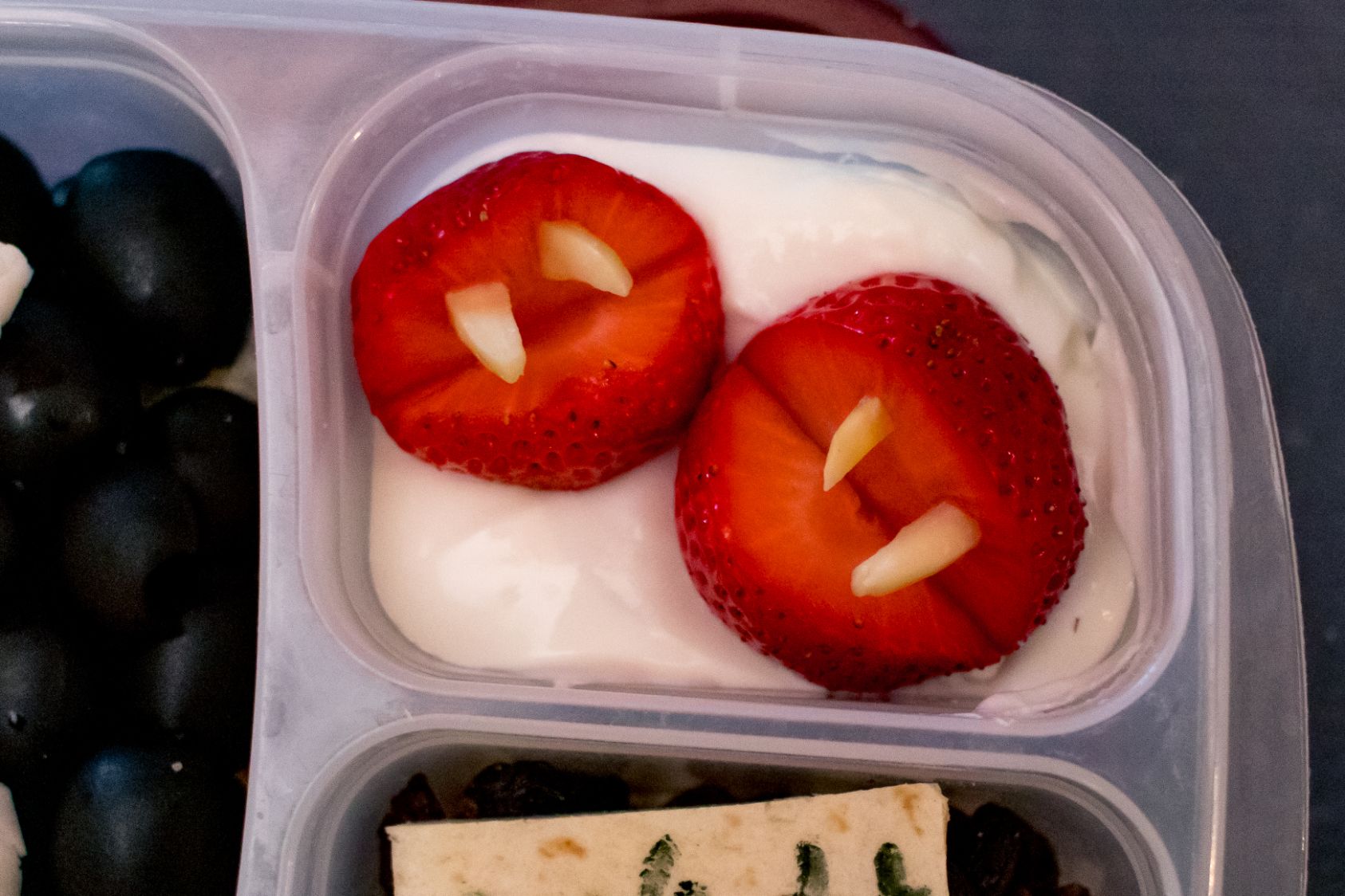 2. Dans le compartiment latéral, mettez le yogourt grec. Transformez les fraises en dents de vampire comme illustré en utilisant des amandes effilées. Mettez-les dans le yaourt. J’en ai fait deux, un pour Edward et un pour Bella.