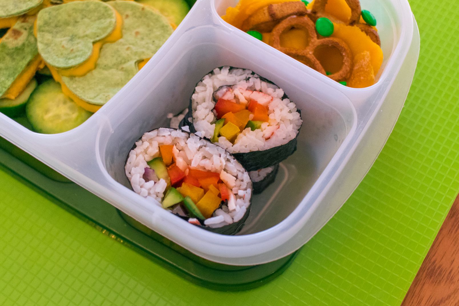 Ingrédients: Tortilla aux épinards, fromage à l’orange, mini concombres, nori, riz sushi cuit, plusieurs couleurs de poivrons, oignon rouge, crabe, mangue séchée, bretzels, vert M & Ms.
