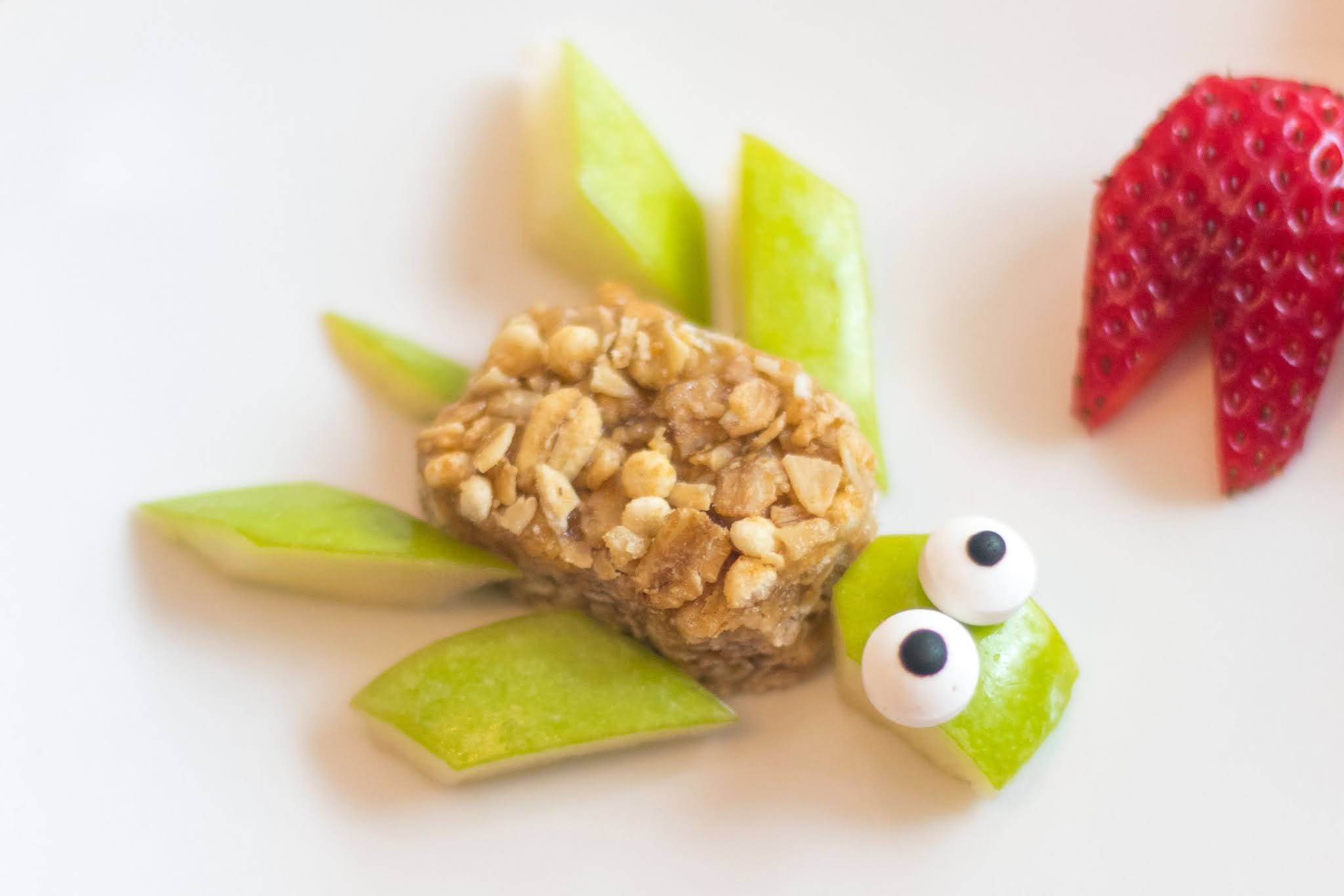 Pour la collation en forme de tortue, coupez la Chewy Granola Bar en deux. Coupez quatre tranches de pomme pour faire des nageoires, une pour la queue et une pour la tête. Disposez toutes les pièces comme indiqué et placez les yeux écarquillés sur le dessus.