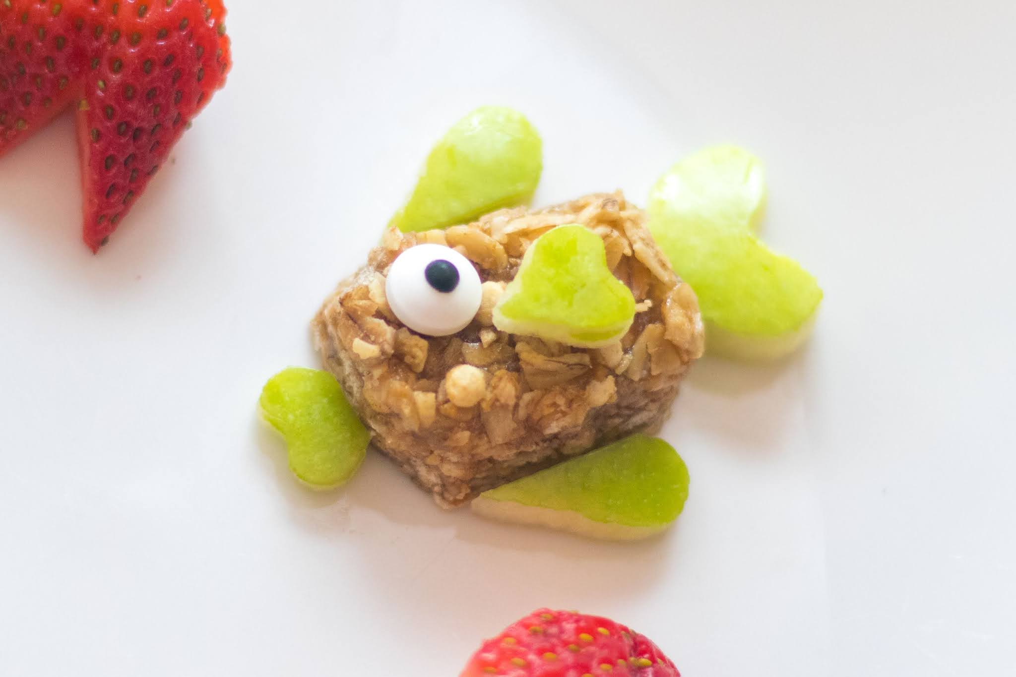 Pour la collation en forme de crabe, coupez la Chewy Granola Bar en deux. Trancher des morceaux de fraise pour faire deux pinces et six pattes. Disposez les griffes à l’avant et les pattes à l’arrière. Placez les yeux écarquillés sur le dessus.