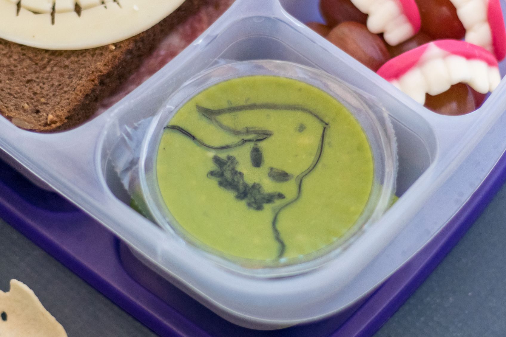 3. Dans le deuxième compartiment latéral, mettez des légumes à tremper dans du guacamole comme le céleri ou les carottes. Sur le mini contenant de guac, dessinez Oogie Boogie à l’aide d’un marqueur permanent. Placer le guac sur le dessus.