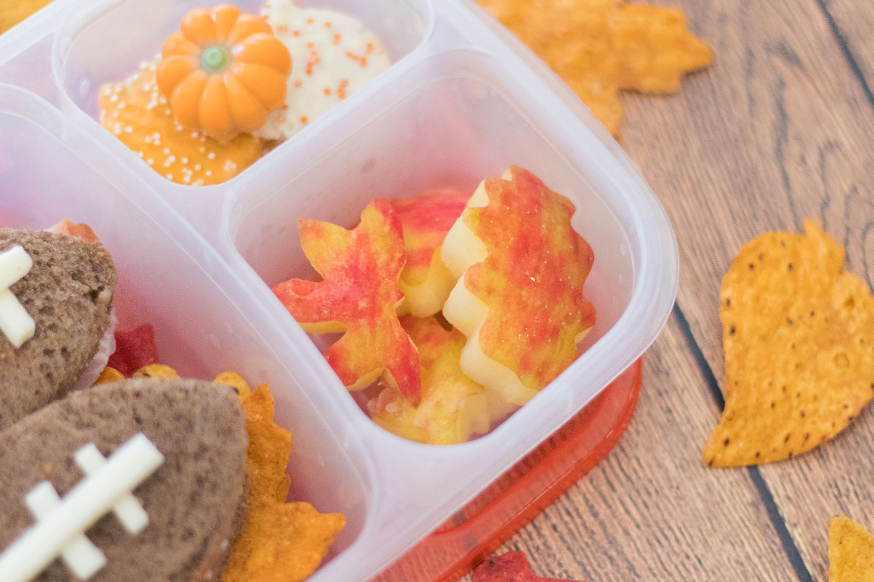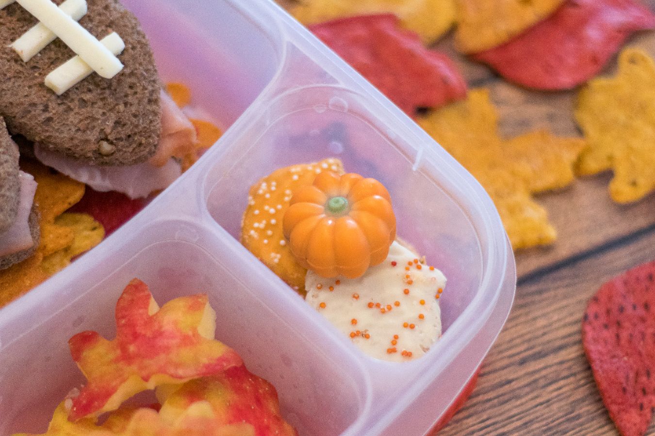 Je n’ai même pas encore parlé de regarder des matchs de la NFL. Nous vivons dans l’Oklahoma, ce qui signifie que les gens vivent et meurent avec OU et OSU, mais nous sommes plus dans les Seahawks de Seattle. Alors oui, vous pouvez dire que le football est un gros problème dans notre maison. C’est pourquoi il est temps de sortir le déjeuner du football. Ce déjeuner comprend des sandwichs au football, des chips et des pommes sur le thème de l’automne et des desserts en forme de citrouille. Je crois que nous avons acheté tous ces côtés sur le thème de l’automne chez Trader Joe’s, mais vous pouvez en trouver des similaires dans différents magasins. Continuez à lire pour le reste des instructions.