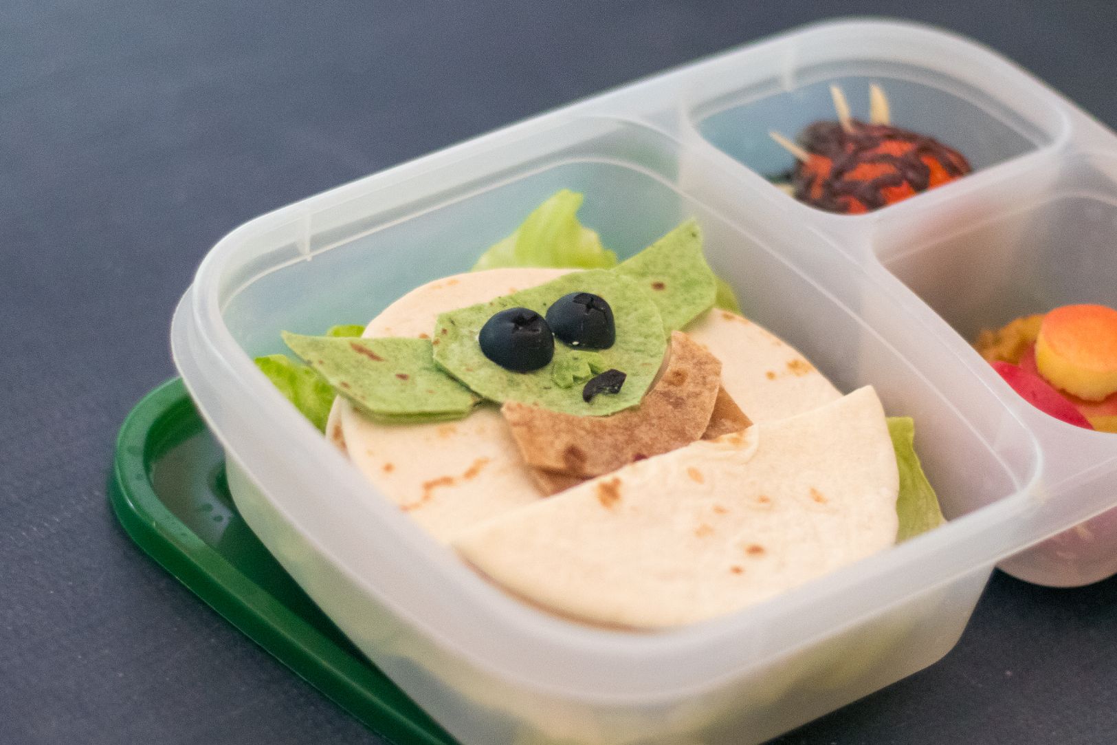 2. Tapisser le compartiment principal de laitue et placer le sandwich Baby Yoda dessus.