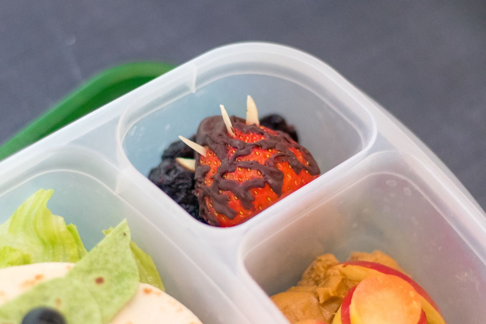 3. Arroser la fraise de chocolat fondant et faire des lignes de chocolat avec un cure-dent. Créez les pointes de Dark Maul en utilisant des amandes avant que le chocolat ne durcisse. Placer dans le compartiment latéral avec les raisins secs.
