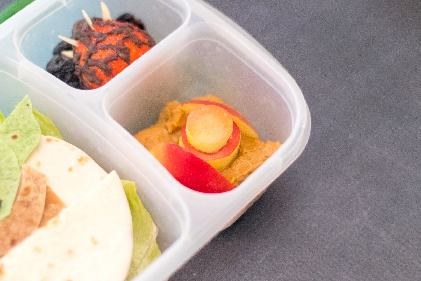 4. Coupez des quartiers de pomme et deux cercles de pomme. Frotter avec des quartiers de citron pour éviter de brunir si nécessaire. Déposez une goutte de tartinade sans noix dans le compartiment latéral. Appuyez sur des morceaux de pomme pour créer un chasseur TIE. Utilisez un cure-dent pour tenir ensemble si nécessaire.