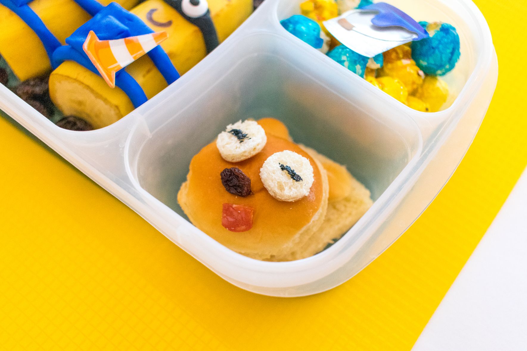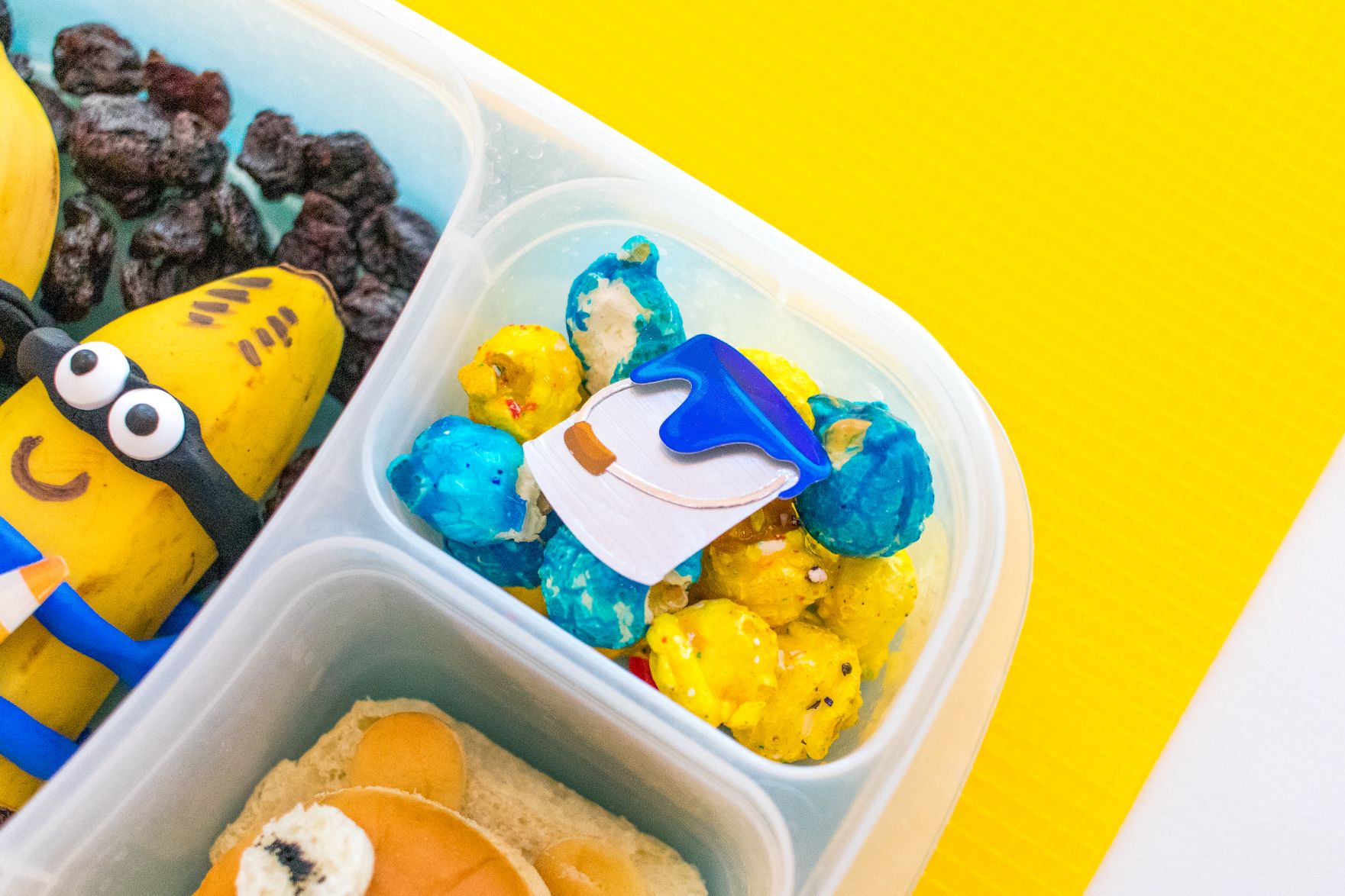 3. Le dernier compartiment latéral contient du pop-corn bleu et jaune, mais vous pouvez utiliser tout ce qui utilise ces couleurs. Terminez le déjeuner en étalant des autocollants autour.