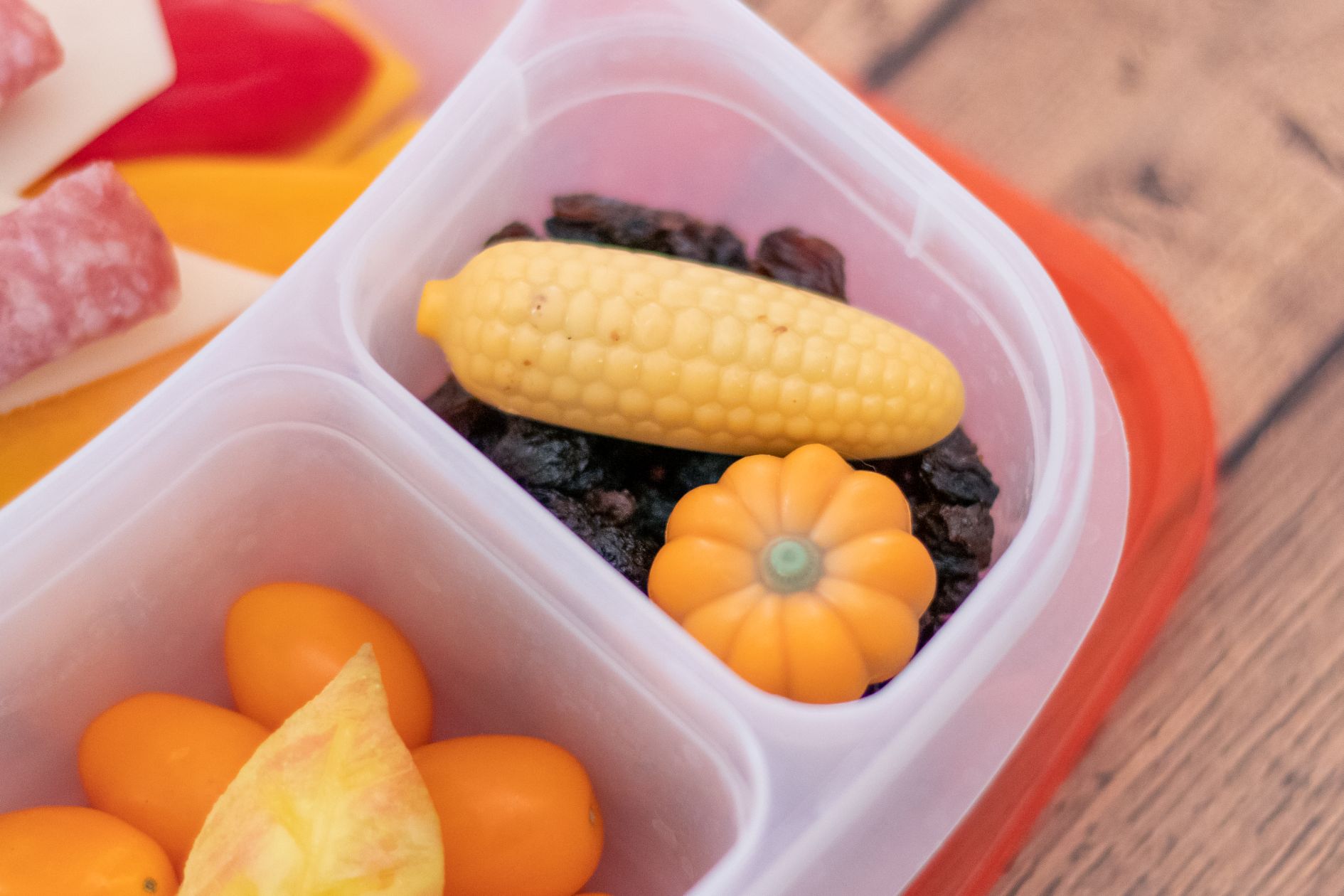 Compartiment latéral 1 : Raisins secs, citrouilles et chocolats en forme de maïs.