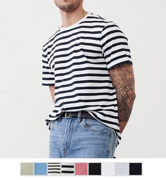 Rayures, unis et quelques options chinées. 100% coton biologique. Coupe décontractée, donc si vous voulez une coupe ajustée, ils vous disent de prendre une taille inférieure.