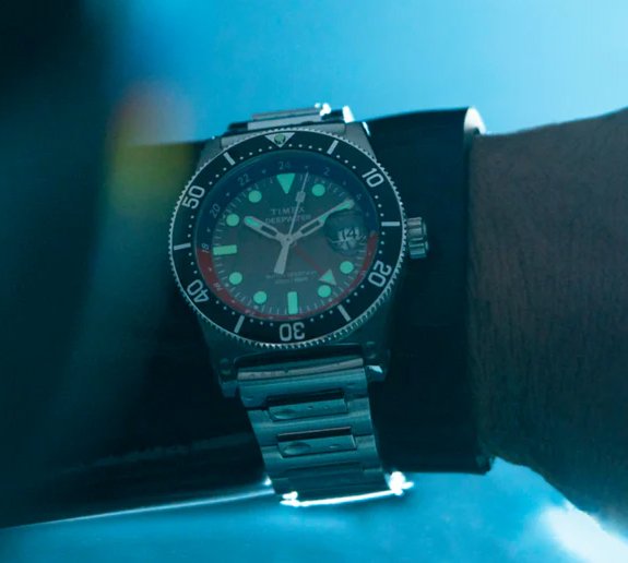 Toujours pas de stock la version régulière (non GMT)mais pour ceux qui veulent une montre GMT prête à voyager qui peut également se baigner sérieusement dans la piscine/lac/océan, alors voici une très bonne option. Voir la revue complète de la version régulière ici. Et en supposant que la GMT soit essentiellement l’OG avec une aiguille supplémentaire et les accessoires fournis avec une aiguille GMT, alors attendez-vous à ce que cette montre soit plutôt géniale. Le bracelet H-link est super confortable et est même livré avec des broches à dégagement rapide. Alors si vous souhaitez l'offrir à un NATO pour une sortie plus décontractée ? Super. Le mettre sur un bracelet en cuir pour le dîner ? Cool. Critique : il y a des erreurs de continuité étranges dans les photos sur le site Timex (à savoir : y a-t-il un cyclope sur la date ou non ? Les photos montrent une montre avec et une montre sans), et curieusement, elles n'ont tout simplement pas corrigé ces écarts.