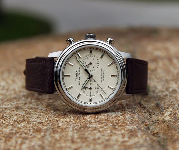 Revue complète ici. Un de leurs nouveaux designs préférés. Cadran crème à couches. Mouvement chronographe à quartz. Bracelet en cuir vieilli avec boucle déployante. Livré également avec des broches à dégagement rapide pour un remplacement facile des sangles.