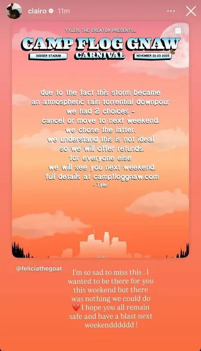 Repousser l'intégralité de votre festival de musique d'une semaine est une manœuvre radicale, mais c'est celle que les organisateurs de Tyler, The Creator's Camp Flog Gnaw Carnival pensaient devoir prendre. Le festival devait avoir lieu samedi et dimanche au Dodger Stadium de Los Angeles, mais en raison du mauvais temps prévu, il a été reporté au week-end suivant et aura désormais lieu les 22 et 23 novembre. Le compte Instagram de Tyler a publié le message suivant aujourd'hui :