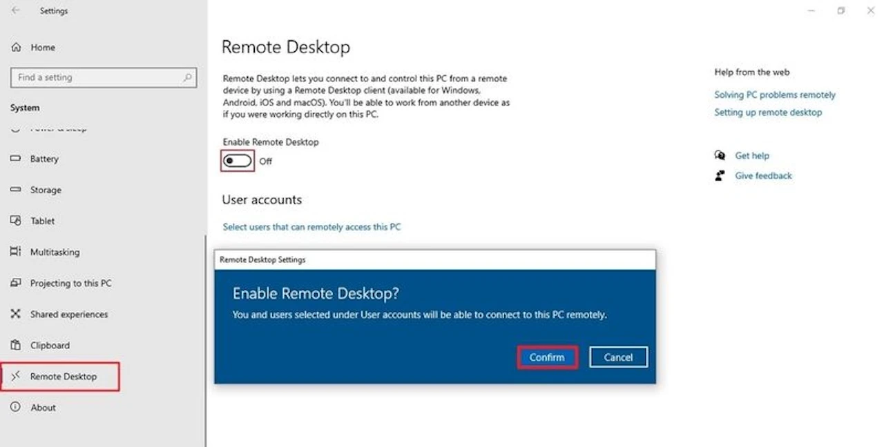 - Activez le commutateur Activer le Bureau à distance et confirmez lorsque vous y êtes invité.