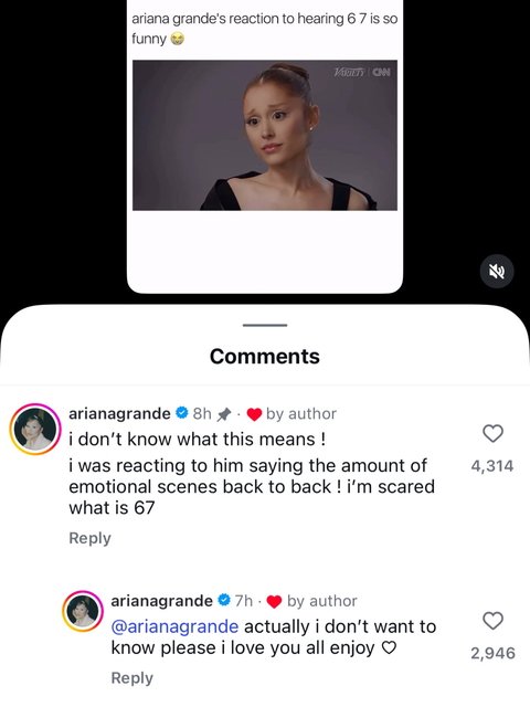 « je ne sais pas ce que ça veut dire ! » Grande a commenté une bobine Instagram du clip viral. « je réagissais à [Sandler] dire le nombre de scènes d'émotion à la suite ! j'ai peur de ce qui fait 67. » Elle a rapidement enchaîné avec un autre commentaire : « en fait, je ne veux pas savoir s'il vous plaît, je vous aime, profitez-en tous. » Voir le clip 6-7 en question ci-dessous.