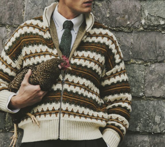 J'aime bien ça, pour être honnête. Fair Isle dans des tons terre discrets, mais avec beaucoup de contraste. Col entièrement zippé pour résister aux rafales soudaines ou… aux picorages de poule ?