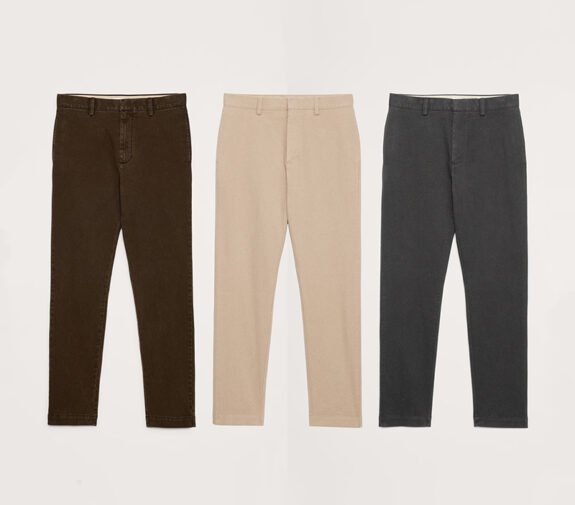 Un de leurs best-sellers. Le point médian entre le chino et le jean. Trois crises. Tissu italien doux et flexible : 58 % coton biologique, 32 % modal, 7 % polyester, 3 % élasthanne. Beaucoup de couleurs.