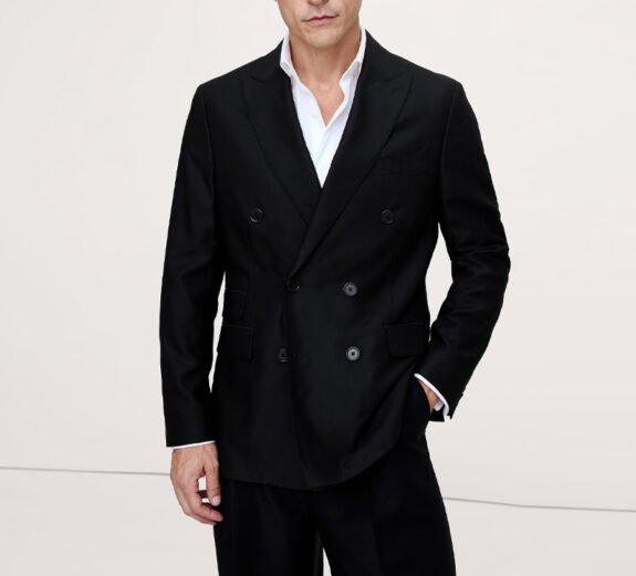 Il est vraiment difficile de porter un costume croisé ici, à l’ère moderne. Mais! C'est vrai, voici comment procéder si vous voulez essayer. Laine hopsack italienne pour la texture. Veste aux épaules douces, ajustée mais pas serrée. Pas de cravate. Il semble dire « Je suis propriétaire de l'endroit et vous êtes ici à ma discrétion. »