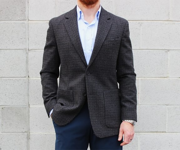 Intéressant grâce aux taches traditionnelles du Donegal, et toujours habillé grâce à la couleur de base sombre. Le tissu est un mélange : 55% polyester recyclé, 40% laine recyclée, 5% autres fibres. Mais c’est pourquoi c’est aussi (enfin) moins de cent dollars. Il est probablement juste de supposer que celui-ci ressemblera à l'option pied de poule tout droit sorti de la boîte. Signification : moins flexible que l’idéal. Ce sont pas le hopsack non construit des Bonobos après tout.