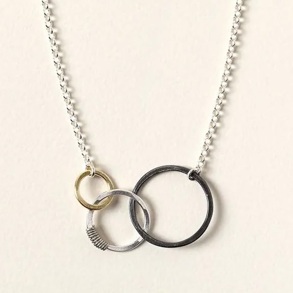 L'artiste joaillière Beth Lawrence représente le passé, le présent et le futur dans ce collier (fabriqué à Nashville, TN). Pouvez-vous deviner quelle bague représente laquelle ?