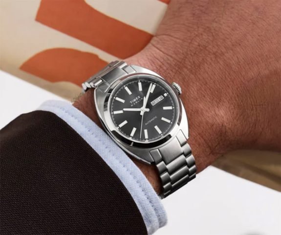Sacré fume. Timex est en fuite ces derniers temps, n'est-ce pas ? On dirait un Aqua Terra. Une vraie montre GADA. Le boîtier en forme de tonneau est principalement brossé mais avec une lunette polie. 37mm de diamètre. Largeur d'entre-corne de 18 mm avec un bracelet en acier inoxydable à dégagement rapide. Cela signifie que lorsque vous le souhaitez, vous pouvez facilement le mettre sur un bracelet en cuir ou même sur un NATO si vous voulez vous amuser. Une résistance à l'eau de 50 m et un cristal minéral ne sont pas les caractéristiques les plus étonnantes mais… regardez-le.