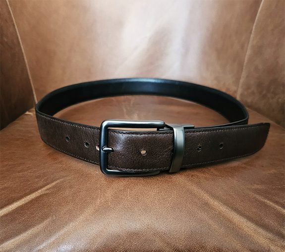 S'accorde avec tout, du t-shirt au jean en passant par un costume et une cravate. Noir d'un côté, marron foncé de l'autre. Beaucoup de ceintures réversibles semblent mettre un cuir marron (trop) clair sur l'autre face du noir. C'est ce que vous voulez. Polyvalence maximale. 1,25″ de large. Fabriqué au Guatemala.