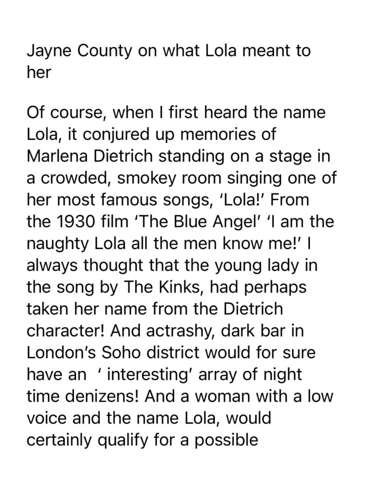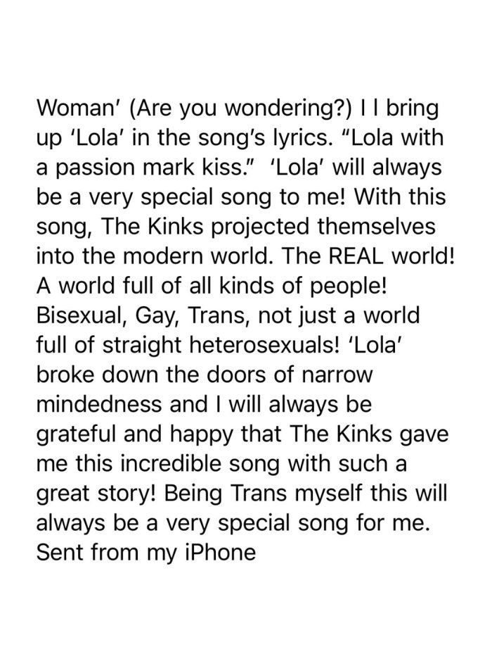 Quand j’ai entendu la chanson, j’étais à la fois ravi et étonné que les Kinks chantent une chanson sur une personne trans et je me suis demandé si quelqu’un d’autre l’avait reprise ! Qui était assez cool ou branché pour comprendre de quoi nous chantons les Kinks ! Lola fera toujours partie de ces chansons qui pour moi ont « brisé la glace » pour ainsi dire ! Une chanson qui brise les barrières et met au premier plan un sujet d'habitude, chut, chut et donne l'impression qu'il est parfaitement naturel de chanter une chanson sur une « fille » nommée Lola ! Je ne pense pas que les stations de radio ont repris le sujet, mais beaucoup de fans l'ont fait et c'est ce qui compte vraiment… Étant moi-même trans, ce sera toujours une chanson très spéciale pour moi.