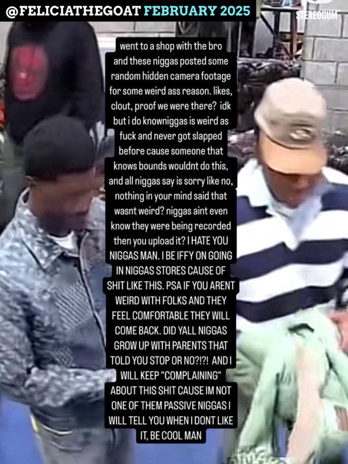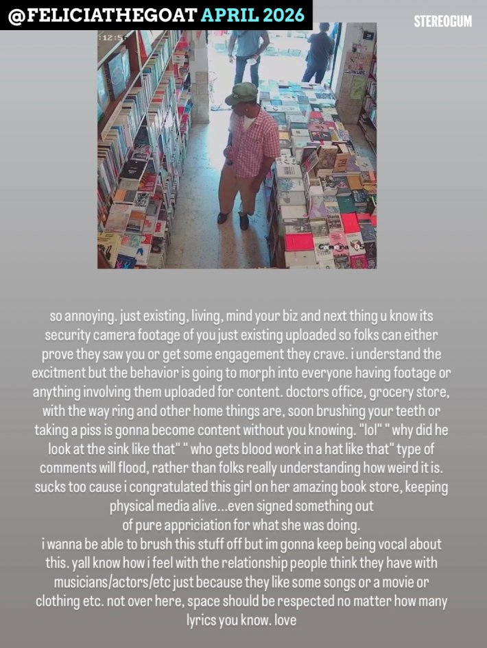 Ce n'est pas la première fois que cela se produit ; il a publié un message similaire fin février de l'année dernière lorsque des images de caméras de sécurité ont été divulguées de lui et de Lil Yachty dans un magasin. Il a également écrit un chanson entière à propos de ça appelé « Noid » de 2024 Chromacopie: « Pas de caméras s'il vous plaît/Je veux manger en paix. »